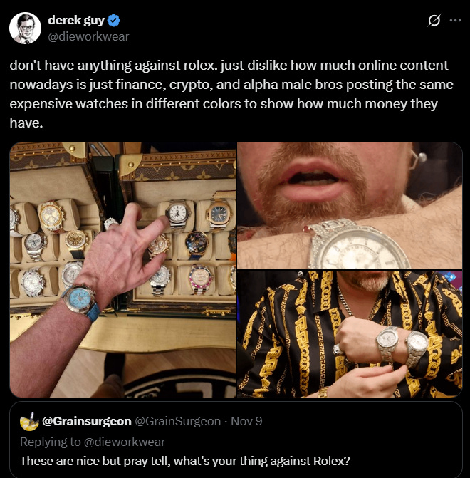 Couldn’t agree more — people continue to buy what they think they’re supposed to buy w/ no research other than what they’ve seen others do. Explain to me why you like your thing anon. This is part of a larger thread of how Rolex, a seriously reputable brand, is dragged down by “flexing” idiots online.